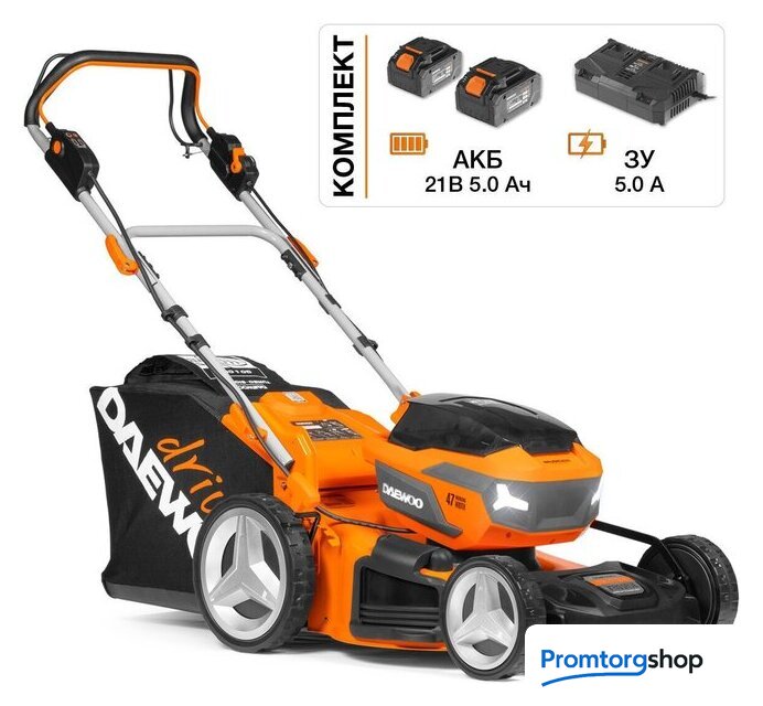 | Комплектация | - Газонокосилка - 1 шт., - Аккумулятор 5,0 Ач - 2 шт., - Зарядное устройство - 1 шт., - Нижняя часть рукоятки - 1 шт., - Верхняя рукоятка - 1 шт., - Травосборник - 1 шт., - Крепежные элементы - 1 комплект, - Руководство по эксплуатации, - Гарантийный талон, - Коробка |