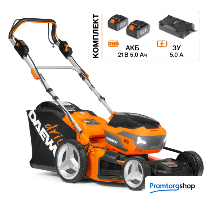| Комплект поставки | Газонокосилка - 1 шт. Аккумулятор 5,0 Ач - 2 шт. Зарядное устройство - 1 шт. Нижняя часть рукоятки - 1 шт. Верхняя рукоятка - 1 шт. Травосборник - 1 шт. Крепежные элементы - 1 комплект Руководство по эксплуатации Гарантийный талон Коробка |
