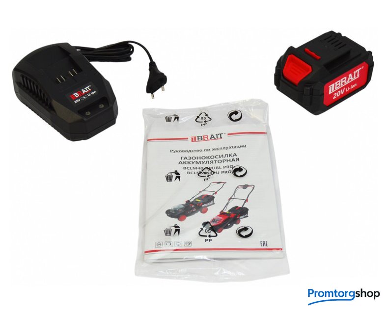 Комплект поставки | Газонокосилка аккумуляторная в сборе; Li-Ion аккумуляторы 4.0А*ч - 1шт; Зарядное устройство 2.4А - 1 шт; Инструкция по эксплуатации. |
