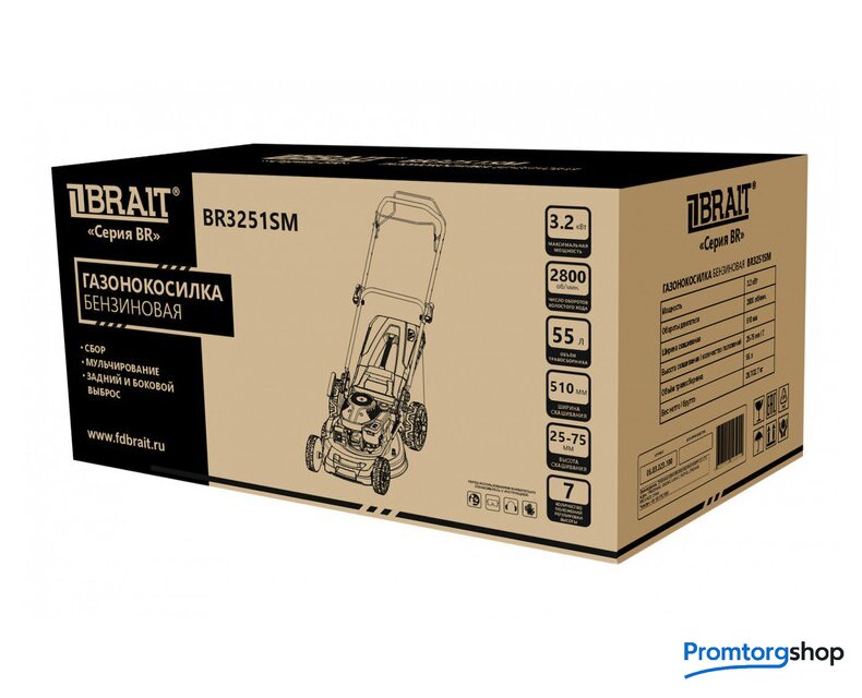 Тип | роторная газонокосилка. Газонокосилка бензиновая BRAIT BR3251SM - незаменимый помощник на участке загородного дома. Масляный щуп. Предназначен для измерения уровня бензина. Вместительный травосборник. Травосборник объемом 55 литров увеличивает продолжительность рабочего цикла. Хранение и транспортировка. Складная рукоятка упрощает хранение и транспортировку бензиновой газонокосилки. ПРЕИМУЩЕСТВА: Самоходная модель, не требующая усилий со стороны пользователя. Удобное управление. Мощный бензиновый двигатель. Функции - сбор, мульчирование, задний и боковой выброс. Большие задние колеса - маневренность. Травосборник вмещает 55 литров травы. Складная рукоятка обеспечивает компактность при хранении и перевозке косилки. Семь ступени высоты скашивания в диапазоне 25-75 мм. Съемный травосборник. |