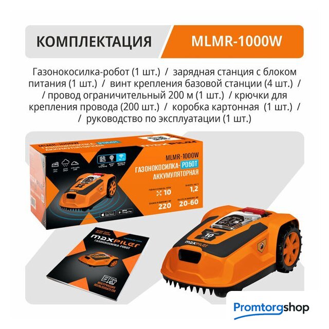 Комплектация | Газонокосилка аккумуляторная со встроенным аккумулятором, зарядная станция с блоком питания, провод ограничительный, крючок для крепления провода (200 шт.), винт крепления базовой станции (4 шт.), коробка, руководство по эксплуатации. |
