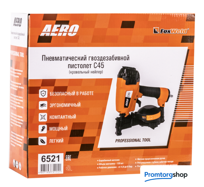 Тип | Кровельный пневматический гвоздезабивной пистолет или нейлер AERO C45 - мощный профессиональный инструмент для надежного забивания гвоздей в любую породу дерева. Предназначен для монтажа мягкой черепицы, кровельной дранки, обустройства заборов из мягких материалов и утепления черновых полов. Устройство позволяет регулировать глубину забивания гвоздей. Контактный предохранитель защитит от случайного выстрела. Удобный спусковой крючок обеспечит быструю работу. Инструмент использует кровельные барабанные гвозди CRN длиной от 19 до 45 мм. Поворотный дефлектор, находящийся на крышке инструмента, позволит выбрать наиболее комфортное для пользователя и окружающих направление выхода воздуха. Эргономичная прорезиненная рукоятка снижает усталость и дискомфорт во время работы. Для работы инструмента необходим воздушный компрессор и подготовленная воздушная магистраль. AERO C45 имеет следующие рабочие параметры - рабочее давление - 4,8 - 8,0 бар и расход воздуха - 1,2 л / выстрел (при 6,0 бар). Для быстрого и надежного подключения оснащается быстросьемным разъемом - Rapid M "папа". ВНИМАНИЕ! При применении инструмента необходимо использовать наушники и спецодежду. Перед использованием обязательно прочтите инструкцию по эксплуатации. ОСОБЕННОСТИ: Тип: профессиональный кровельный нейлер (пневматический гвоздезабивной пистолет) Тип магазина: барабанный с боковой загрузкой Ёмкость магазина: 120 шт. Рабочее давление: 4,8 - 8,0 бар Присоединительные параметры: предустановленный фитинг Rapid M - 1/4"M (быстросъёмное соединение) Расход воздуха: 1,2 л / выстрел (при 6,0 бар) Предохранитель Регулировка глубины забивания Эргономичная прорезиненная рукоятка Регулируемое направление выхлопа Параметры совместимой оснастки: Тип: CRN (гвозди кровельные барабанные в конической бобине) Кол-во в бобине: 120 шт. Длина: 19 - 45 мм Диаметр стержня: 3,05 мм Диаметр шляпки: 10,00 мм Накатка: гладкая, кольцевая ("ёрш") Угол наклона: 15 градусов |