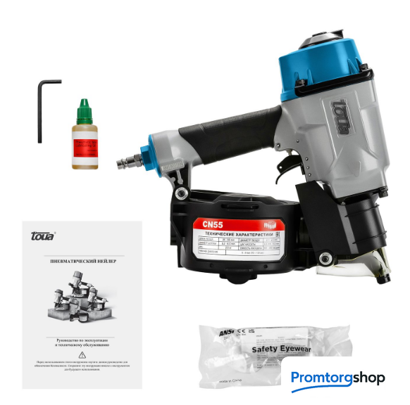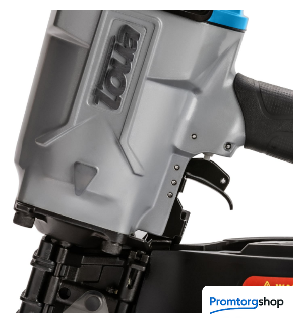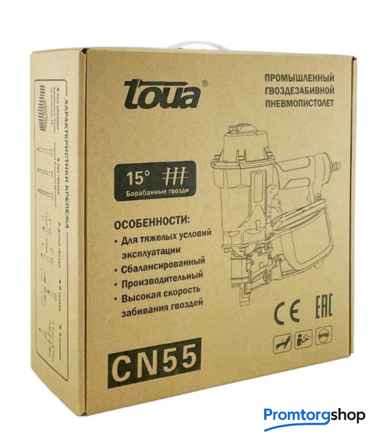 | Тип | Toua CN55 гвоздезабивной пневматический пистолет барабанного типа работает с гладкими, ершеными и винтовыми гвоздями соединенными между собой проволокой. Обладает высокой производительностью, большим ресурсом и низкой стоимостью точки крепления. Подходит для работ на производстве и конвейерной сборки. Toua CN55 предназначен для паллетного и мебельного производства, когда инструмент работает с горизонтальным материалом. Тяжелый корпус инструмента позволяет увеличивать поточную стрельбу на отскоке и экономить силы оператора. Барабанные пистолеты ориентированы на работу в вертикальном положении, что делает их идеальным выбором для конвейерных работ. В качестве расходников для них применяются: гладкие, ершёные и винтовые гвозди (соединённые между собой проволокой). Барабанные пистолеты обладает очень большой скорострельностью и способны производить по два-три выстрела в секунду. Барабан рассчитанный на большое количество расходников и быстрая перезарядка позволяет достигать поистине "стахановского" темпа работы. |