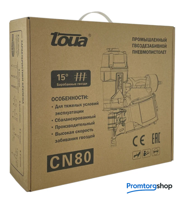 | Тип | Toua CN80 гвоздезабивной пневматический пистолет барабанного типа работает с гладкими, ершеными и винтовыми гвоздями соединенными между собой проволокой. Обладает высокой производительностью, большим ресурсом и низкой стоимостью точки крепления. Подходит для работ на производстве и конвейерной сборки. Toua CN80 предназначен для паллетного и мебельного производства, когда инструмент работает с горизонтальным материалом. Тяжелый корпус инструмента позволяет увеличивать поточную стрельбу на отскоке и экономить силы оператора. Барабанные пистолеты ориентированы на работу в вертикальном положении, что делает их идеальным выбором для конвейерных работ. В качестве расходников для них применяются: гладкие, ершёные и винтовые гвозди (соединённые между собой проволокой). Барабанные пистолеты обладает очень большой скорострельностью и способны производить по два-три выстрела в секунду. Барабан рассчитанный на большое количество расходников и быстрая перезарядка позволяет достигать поистине "стахановского" темпа работы. Преимущества TOUA CN80 Полностью металлический корпус для надежности Обрезиненная рукоятка для удобства оператора Ключевая регулировка заглубления для стабильности работы Производительность до 3 выстрелов в секунду для высокого темпа производства Защитный кожух на стволовой части для предотвращения засоров и загрязнения Регулируемый отвод отработанного воздуха для удобства |