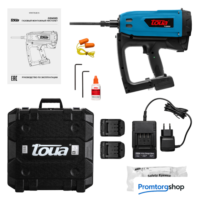 | Комплектация | Гвоздезабиватель: 1 шт. Аккумуляторная батарея: 2 шт. Зарядное устройство: 1 шт. Адаптер 220V AC-7.2V DC: 1 шт. Пластиковый кейс: 1 шт. Инструкция: 1 шт. Очки: 1 шт. |