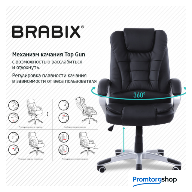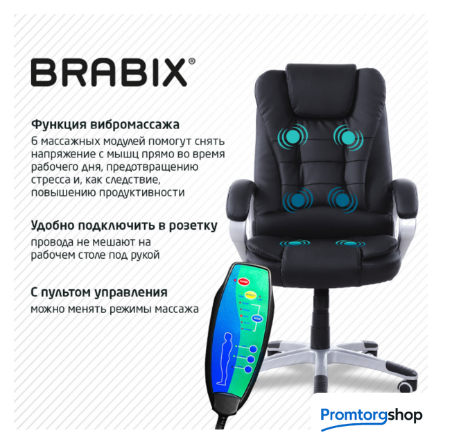 | Назначение | для руководителя, для персонала. Благодаря данному креслу времяпровождение в офисе станет гораздо приятнее! Восстановительный массажный эффект прямо на рабочем месте - залог продуктивной работы и гарантия хорошего настроения в течение всего дня. Эргономичная конструкция кресла обеспечивает пользователю максимальный уровень комфорта. 6 массажных модулей, встроенных в спинку кресла, помогут снять проблемы сидячего образа жизни. Модель оснащена надежным механизмом качания «Top Gun», который позволяет осуществлять свободное качание с фиксацией в рабочем положении и регулировкой наклона под вес сидящего. Прочные пластиковые подлокотники имеют мягкие накладки. Тип питания — от сети 220 Вольт. Страна производства: Россия |