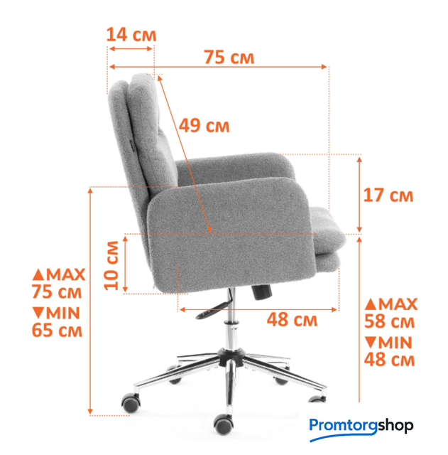 | Высота кресла (стула) | Высота по подлокотникам от 65 до 75 см. Высота подлокотника 17 см |