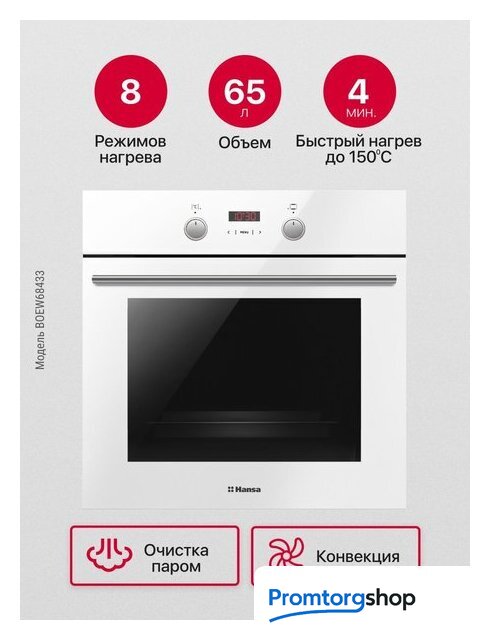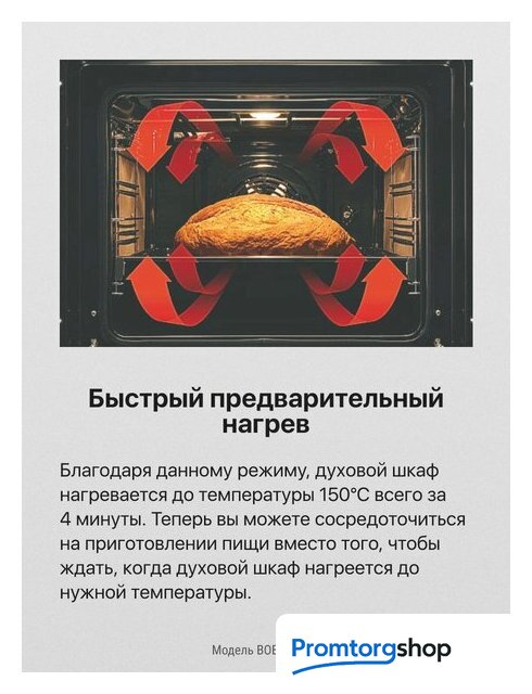 | Режимы работы | нижний нагрев, двухсторонний нагрев, большой гриль, гриль + конвекция, двухсторонний нагрев + конвекция, размораживание, предварительный разогрев духовки |