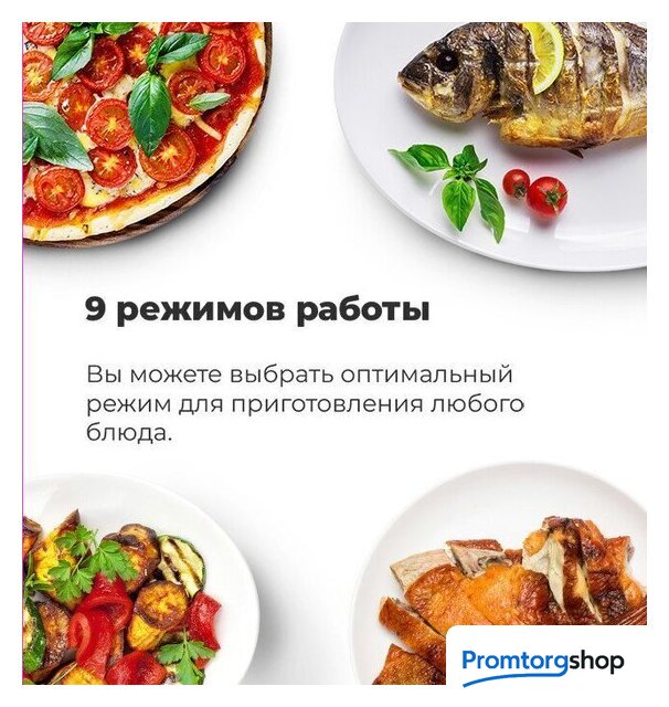 | Режимы работы | нижний нагрев, двухсторонний нагрев, большой гриль, гриль + конвекция, двухсторонний нагрев + конвекция, размораживание |