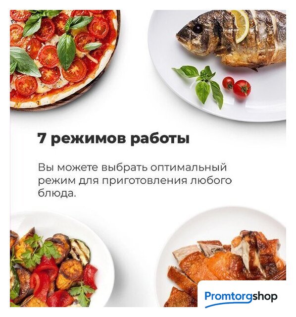 | Режимы работы | нижний нагрев, двухсторонний нагрев, большой гриль, нижний нагрев + конвекция, двухсторонний нагрев + конвекция |