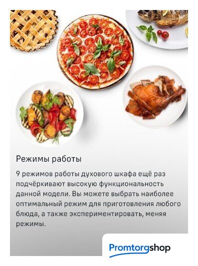| Режимы работы | нижний нагрев, двухсторонний нагрев, большой гриль, вентиляционный нагрев, гриль + конвекция, двухсторонний нагрев + конвекция, размораживание |