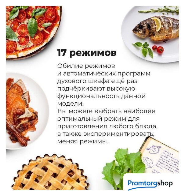 | Режимы работы | нижний нагрев, двухсторонний нагрев, большой гриль, гриль + конвекция, нижний нагрев + конвекция, двухсторонний нагрев + конвекция, размораживание, предварительный разогрев духовки, подготовка теста |