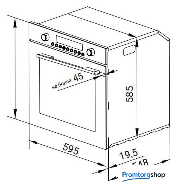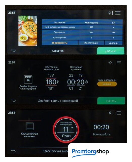 | Режимы работы | нижний нагрев, верхний нагрев, двухсторонний нагрев, большой гриль, вентиляционный нагрев, гриль + конвекция, двухсторонний нагрев + конвекция, размораживание, поддержание температуры (подогрев), подготовка теста |