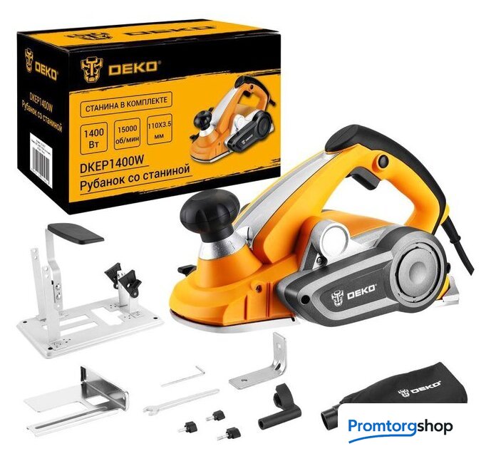 Комплект поставки | Рубанок - 1 штПодставка - 1 штВинт зажимной - 3 штКлюч (гаечный) - 1 штКлюч шестигранный - 1 штПылесборник - 1 штКронштейн крепления линейки - 1 штКронштейн установки глубины фальца - 1 штБлокировка переключателя - 1 штИнструкцияКоробка |