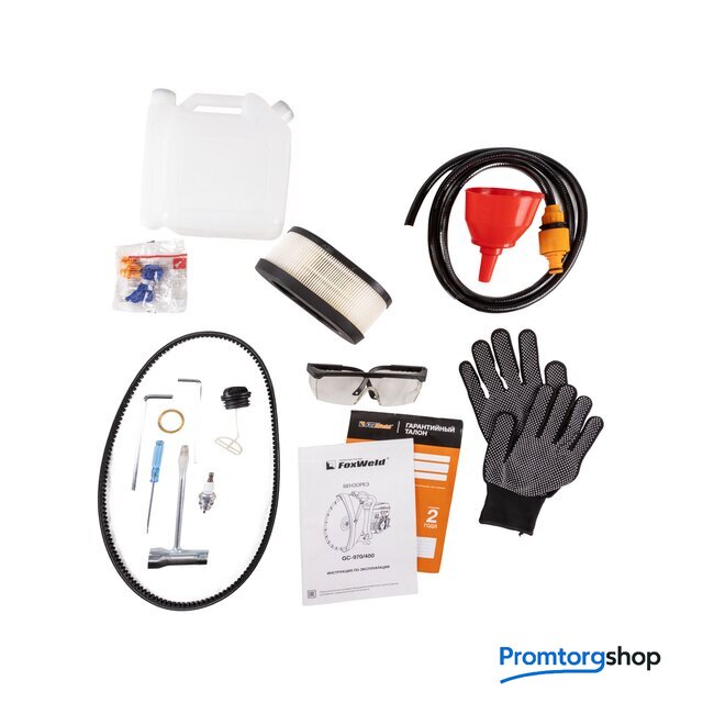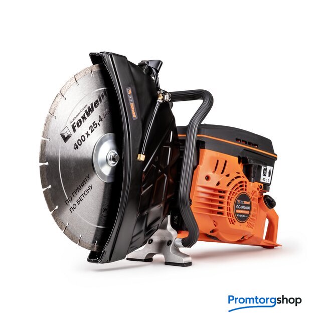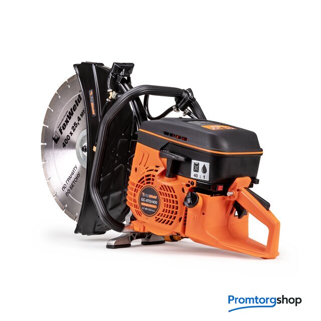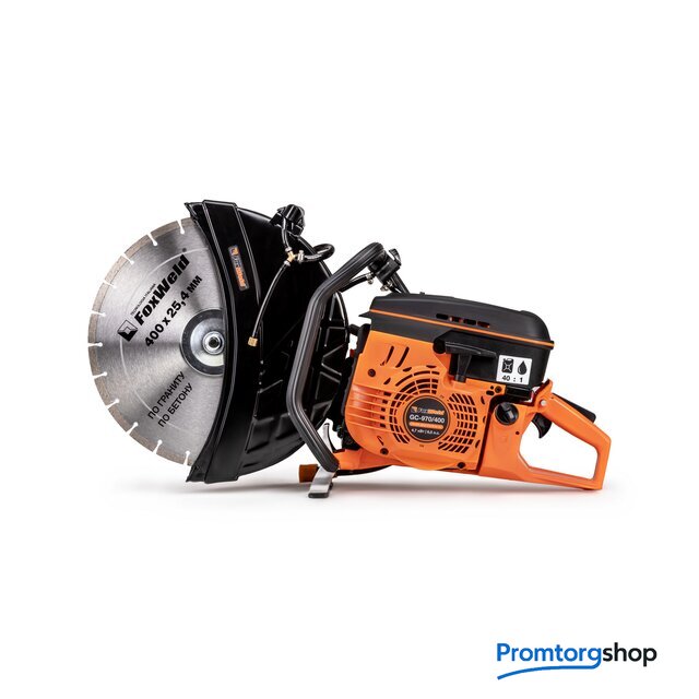 Комплект поставки | • Бензорез Foxweld GC-970/400 – 1 шт.; • Диск отрезной по металлу 400 мм*25,4 мм – 1 шт.; • Диск алмазный по бетону 400 мм*25,4 мм – 1 шт.; • Кольцо переходное 32 мм на 25,4 мм – 1 шт.; • Бак для топливной смеси – 1 шт.; • Воронка – 1 шт.; • Беруши – 1 комплект; • Ключ универсальный – 1 шт.; • Очки защитные – 1 шт.; • Свеча зажигания – 1 шт.; • Крышка топливного бака – 1 шт.; • Отвёртка – 1 шт.; • Перчатки – 1 комплект.; • Шланг для подачи воды 1,5 м – 1 шт.; • Ключ шестигранный HEX – 2 шт.; • Ремень – 1 шт.; • Фильтр воздушный – 1 шт.; • Инструкция по эксплуатации + Гарантийный талон – 1 комплект. |