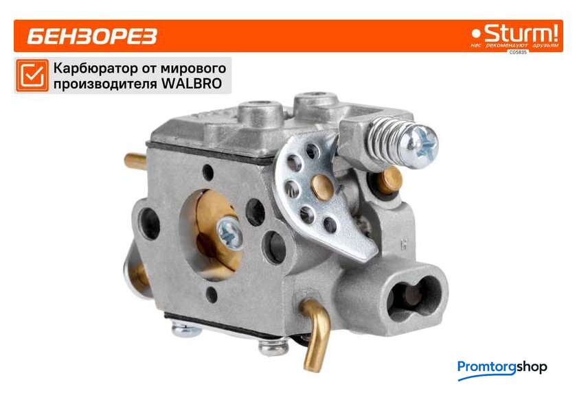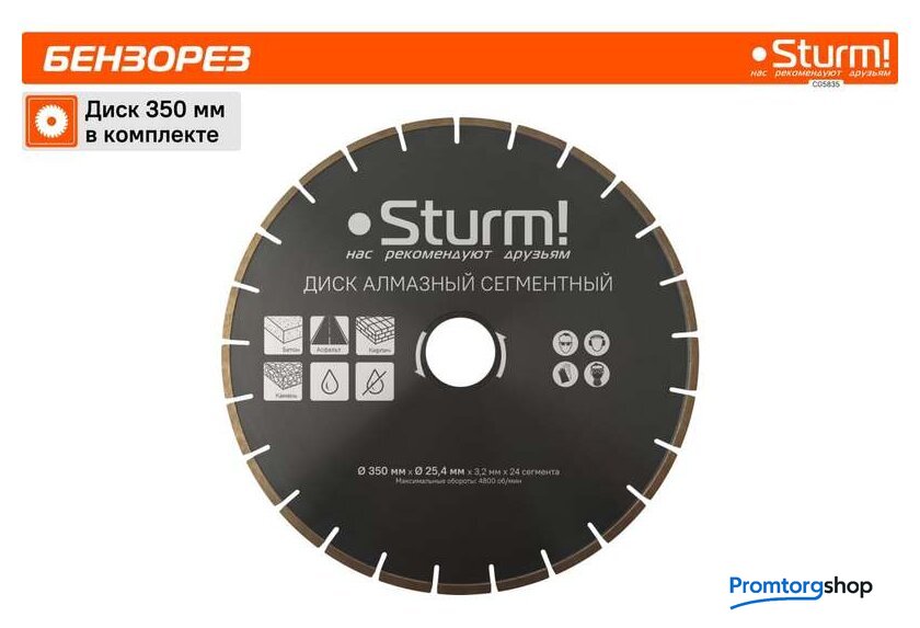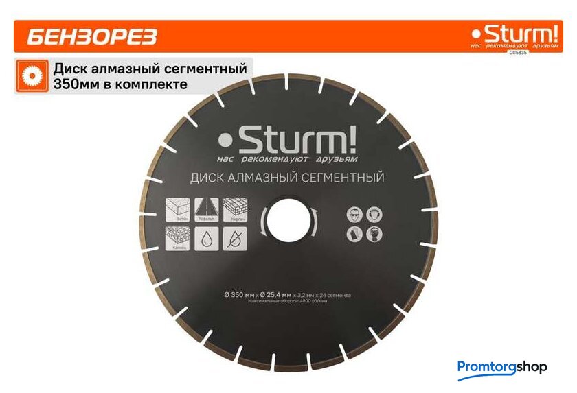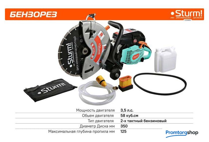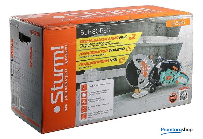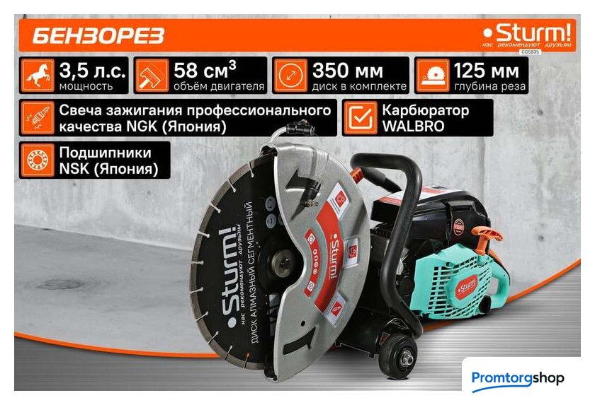 Тип | бензорез. Водяное охлаждение диска. Бензорез - это универсальный ручной инструмент, рабочими элементами которого являются металлический режущий диск, покрытый алмазным напылением, рукоятка, привод и 2-х тактный бензиновый двигатель. Применяется инструмент для демонтажа бетонных, металлических конструкций, изделий из камня. Бензорез способен разрезать металлическую балку, тротуарную плитку, вырезать проем в бетонной стене и многое другое. Используется не только в строительстве, но и в дорожных работах, а так же в спасательных операциях. Преимущества Sturm CG5835 Карбюратор фирмы WALBRO - одного из ведущих производителей карбюраторов в мире Свеча зажигания NGK (Япония) Подшипники NSK (Япония) |