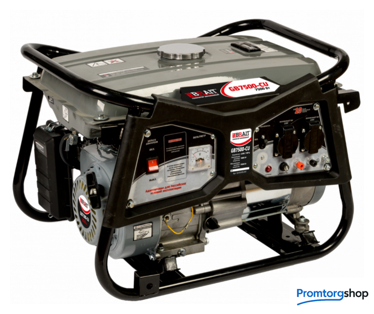 | Тип | Генератор бензиновый BRAIT GB-7500-CU(E) – подходящий вариант для тех, кто ищет однофазную модель для аварийного снабжения электричеством в ситуациях отсутствия электросети. Его часто приобретают для строительных и ремонтных площадок, загородных домов, дач, коттеджей, личного хозяйства, социальных объектов и т.д. К этому бензиновому генератору можно подключать мощные бытовые электроприборы и различное хозяйственное оборудование. Его номинальная мощность составляет 7000Вт, при этом агрегат производит качественное электричество 220 В. GB-7500-CU(E) оснащен четырехтактным бензиновым двигателем, работающем на АИ-92 бензине. Он обладает мощностью 15 лошадиных сил и имеет воздушное охлаждение. Емкость бака для топлива - 25 литров. Полной заправки будет достаточно на восемь часов беспрерывной работы при среднем уровне загрузки. На корпусе генератора размещены две обычные розетки 32А и 16А. Медная обмотка увеличивает срок службы генератора. Контролировать напряжение можно посредством простого вольтметра, находящегося на передней панели корпуса. Генератор бензиновый BRAIT GB-7500-CU(E) легко запускается в работу стандартным ручным и электростартером Конструкция корпуса агрегата имеет надежную раму из прочных металлических труб. Это обеспечивает надежную защиту генератора. Компактные размеры и небольшой вес облегчают транспортировку и перемещение бензинового генератора, делают его положение устойчивым на любой местности. |