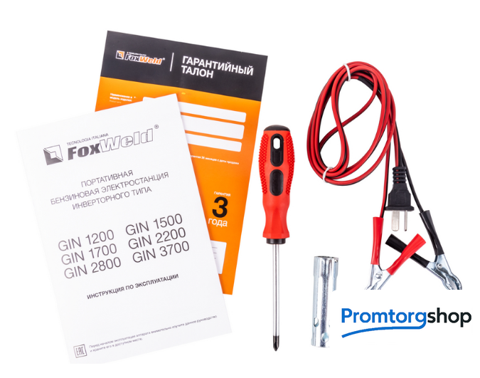 | Комплектация | Бензиновый инверторный генератор FoxWeld GIN 1500 – 1 шт. Свечной ключ – 1 шт. Отвёртка - 1 шт. Провод с вилкой 12В для зарядки АКБ - 1 шт. Инструкция + гарантийный талон – 1 комплект |