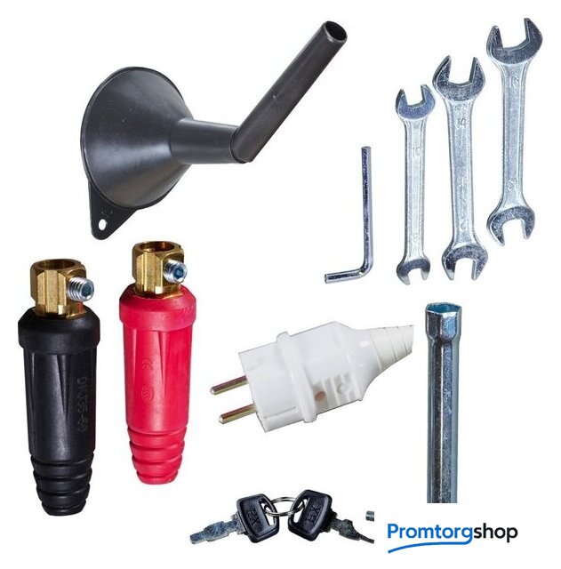 | Комплектация | • Вилка 16А/220В (1 шт)• Свечной ключ (1 шт)• Разъемы для подключения сварочных кабелей (2 шт красный + 1 шт черный)• Ключ электростартера (2 шт)• Набор инструментов (ключи гаечные 3 шт, отвертка 1 шт)• Воронка для заливки масла (1 шт) |