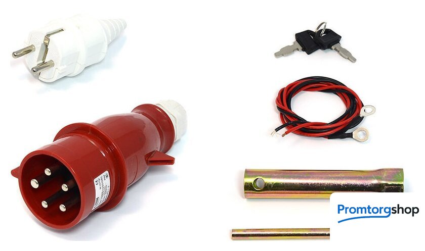 Комплектация | - Электрическая вилка - 3 шт., - разъем для АВР, - комплект проводов, - свечной ключ, - колёса. |