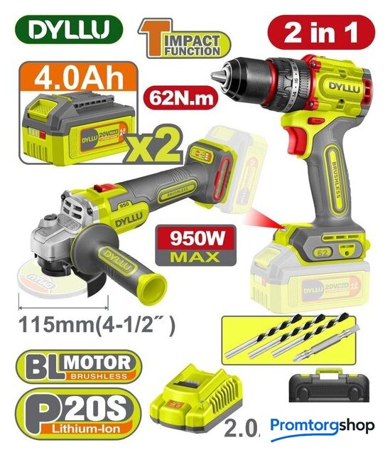 | Комплектация | - Дрель-шуруповерт DYLLU DTCDP6281 - 1 шт.- Угловая шлифмашина DYLLU DTLAP5322 - 1 шт.- Аккумулятор 4,0 А*ч (DTLBP540) - 2 шт.- Зарядное устройство (DTFCP518) - 1 шт.- Боковая рукоятка - 1 шт.- Защитный кожух - 1 шт.- Фланцевый ключ - 1 шт.- Бита Cr-V 65 мм - 1 шт.- Сверла по бетону - 3 шт.- Инструкция- Кейс |
