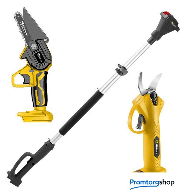 Комплектация | - Секатор аккумуляторный.- Пила цепная аккумуляторная.- Шина.- Цепь.- Телескопическая штанга.- Плечевой ремень.- Набор инструментов.- Аккумуляторы 2 шт.- Стационарное зарядное устройство. |