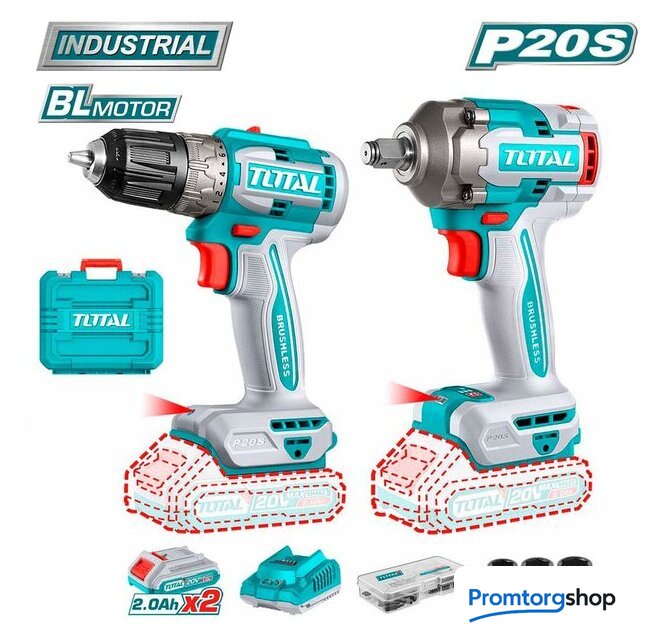 Комплектация | - Дрель-шуруповерт TDLI204531 - 1 шт.- Гайковерт TOTAL TIWLI2040 - 1 шт.- Аккумулятор TFBLI20011 2 А*ч - 2 шт.- Зарядное устройство TFCLI2001 - 1 шт.- Торцевые головки (17, 19, 21 мм) - 3 шт.- Аксессуары 47 - шт.- Инструкция- Кейс |
