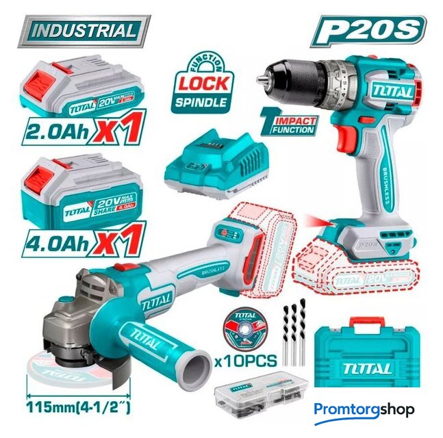| Комплектация | Дрель-шуруповерт TOTAL TIDLI206681 - 1 шт. Угловая шлифмашина TOTAL TAGLI21154 - 1 шт. Аккумулятор 2,0 А*ч - 1 шт. Аккумулятор 4,0 А*ч - 1 шт. Быстрое зарядное устройство - 1 шт. Боковая рукоятка - 1 шт. Защитный кожух - 1 шт. Фланцевый ключ - 1 шт. Отрезной диск - 10 шт. Набор набор аксессуаров 47 шт. Инструкция Кейс |
