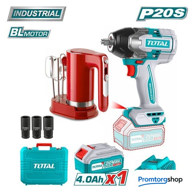 Комплектация | - Гайковерт TOTAL TIWLI20851 - 1 шт.- Аккумулятор TFBLI2002 4,0 Ач - 1 шт.- Зарядное устройство TFCLI2001E - 1 шт.- Торцевая головка (22, 24, 27 мм) - 3 шт.- Миксер TMK006H - 1 шт.- Венчики - 2 шт.- Вспениватель молока - 1 шт.- Кейс |