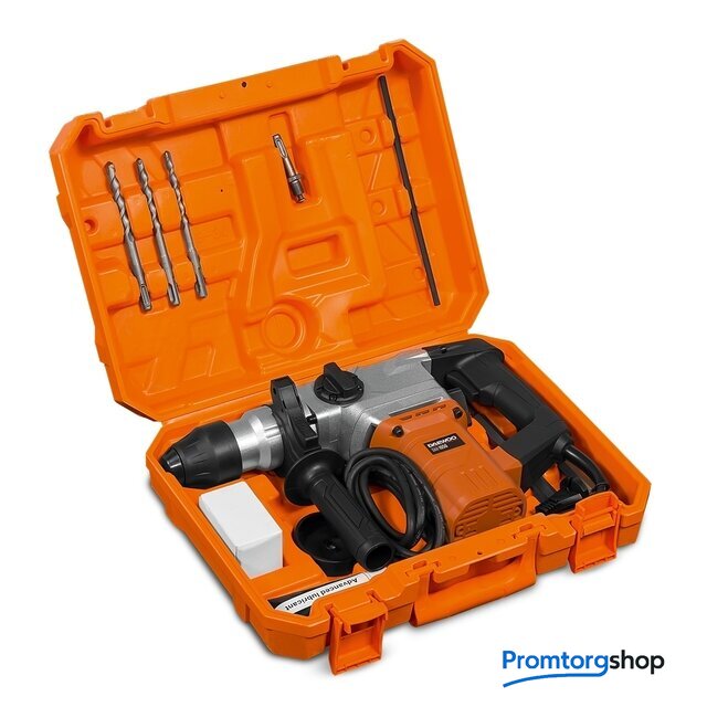 Комплект поставки | - Перфоратор – 1 шт.- Дополнительная рукоятка – 1 шт.- Измеритель глубины сверления/ бурения – 1 шт.- Буры 150 мм 8/10/12 мм - 3 шт.- Долото – 1 шт.- Пика – 1 шт.- Ограничительная линейка – 1 шт.- Дополнительная рукоятка – 1 шт.- Дополнительный зубчато-винтовой патрон с адаптером – 1 шт.- Ключ для патрона – 1 шт.- Смазка – 1 шт.- Пылезащитный колпачок – 1 шт.- Угольные щетки – 1 комп.- Кейс – 1 шт.- Руководство пользователя – 1 шт.- Гарантийный талон – 1 шт. |