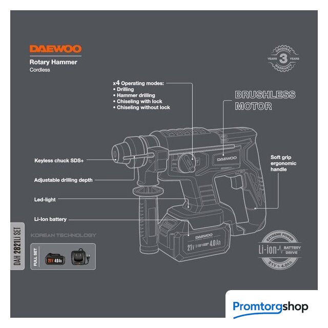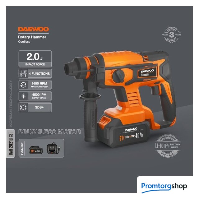 Комплект поставки | - Перфоратор - 1 шт.- Аккумулятор 4,0 Ач - 1 шт.- Зарядное устройство - 1 шт.- Дополнителная рукоятка - 1 шт.- Буры 6, 8, 10 мм. - 3 шт.- Долото острое - 1 шт.- Долото плоское - 1 шт.- Инструкция- Кейс |