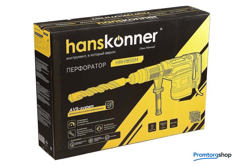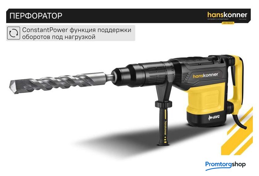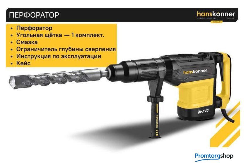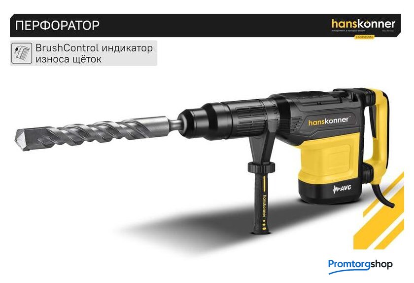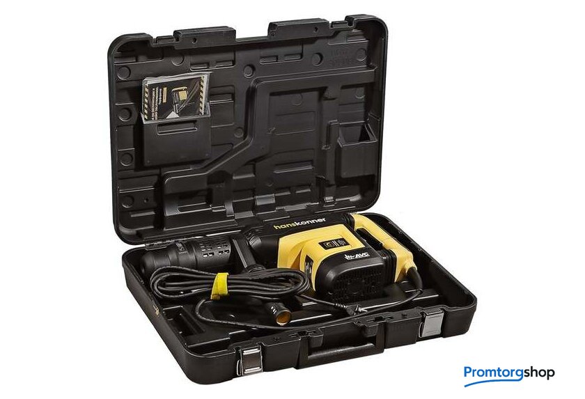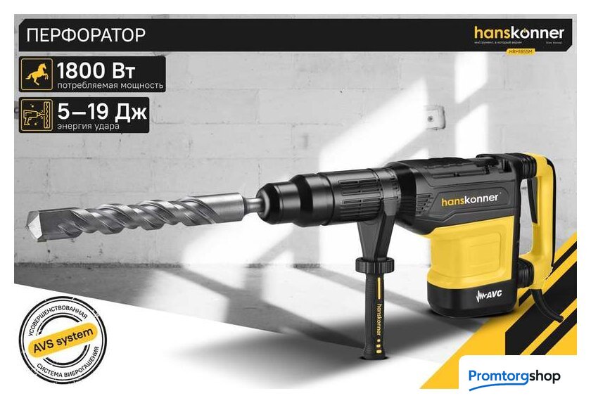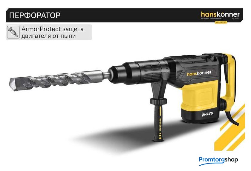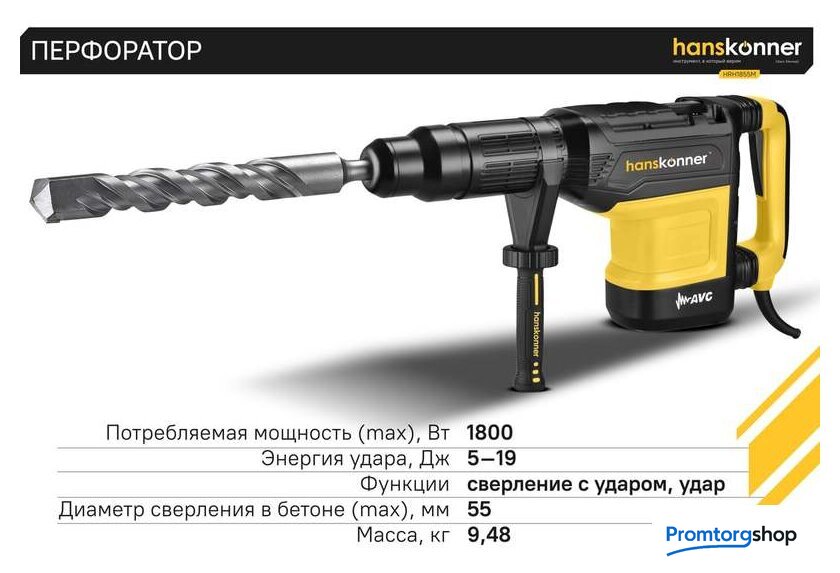 | Режимы работы | долбление, сверление с ударом. Перфоратор HRH1855M — мощный, маневренный электроинструмент для сверления отверстий в таких материалах как кирпич, бетон или снятия старой керамики, штукатурки. В целях выполнения конкретной задачи следует выбрать один из режимов: «удар» или «сверление с ударом». Оптимальной настройке к проведению определенной задачи содействует электронная регулировка оборотов, а контроль постоянства мощности способствует продуктивному выполнению работ. Модель отличается встроенной системой виброгашения «AVS-system», которая поддерживает удобство и безопасность при использовании перфоратора. Бронированный ротор благоприятствует надежности при выполнения протяжных работ в условиях повышенной запыленности. Патрон SDS-МАХ предоставляет возможность быстрого и верного крепления необходимой оснастки. Регулируемость дополнительной рукояти вмести с индикатором износа угольных щеток придают удобства в обращении с перфоратором. Морозостойкий резиновый сетевой кабель длинной 6 м стимулирует комфорт при длительном применении |