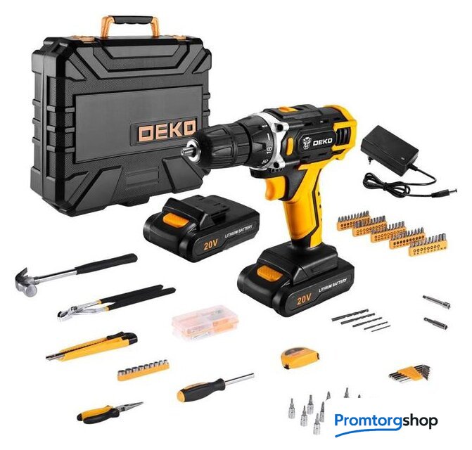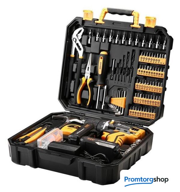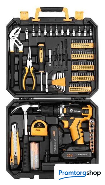 | Комплектация | Дрель-шуруповерт 1 шт зарядное устройство2 шт аккумулятор11 шт 1/4" биты: SL4,5.5, PH1,2, PZ1,2, H3,4, T10,15,20,1 шт 1/4" универсальный шарнир,1 шт магнитный держатель бит 60мм,1 шт 1/4" x3 удлинитель,1 шт переставной ключ,1 шт 6" плоскогубцы,1 шт держатель бит 6,35 мм,Шестигранные ключи: 1,5-6 мм,5 шт сверла: 2,3,4,5,6мм,50 шт 25L биты: SL3,3,4,5,6, PH0,0,1,1,2,2,3,3, PZ0,0,1,1,2,2,3,3, H1,5, 1,5,2,2,3,4,4,5,5,5,5,6,6, T10,15,20,25,27,30,35, S0,0,1,1,2,2,3, 3, AD, AD, 9 шт. 1/4" розетки: 5,6,7,8,9,10,11,12,13 мм,1 шт измерительная лента 3м,1 шт молоток,1 шт строительный нож 18мм,103 шт крепежКейс |