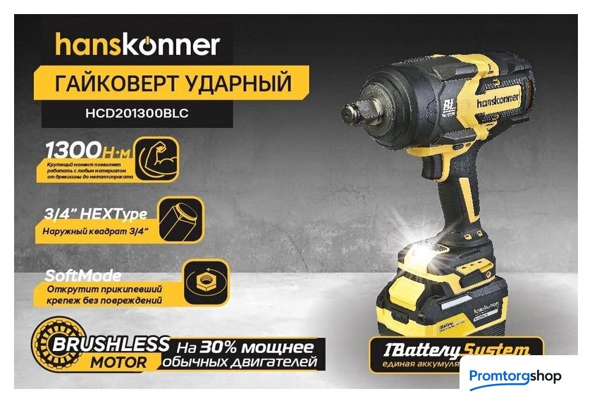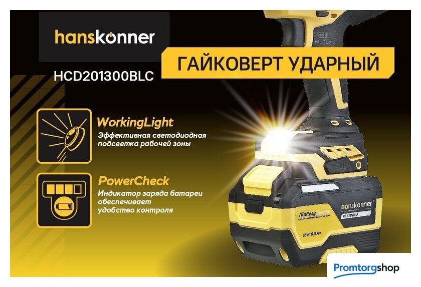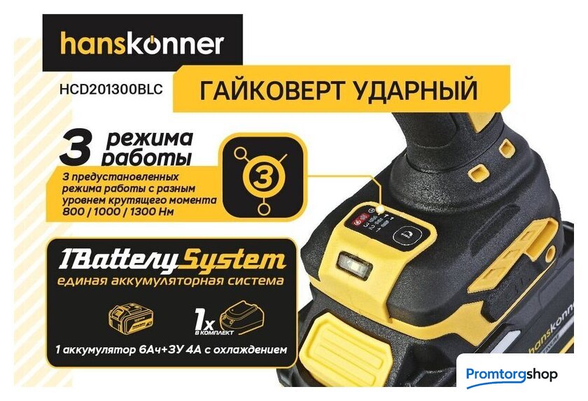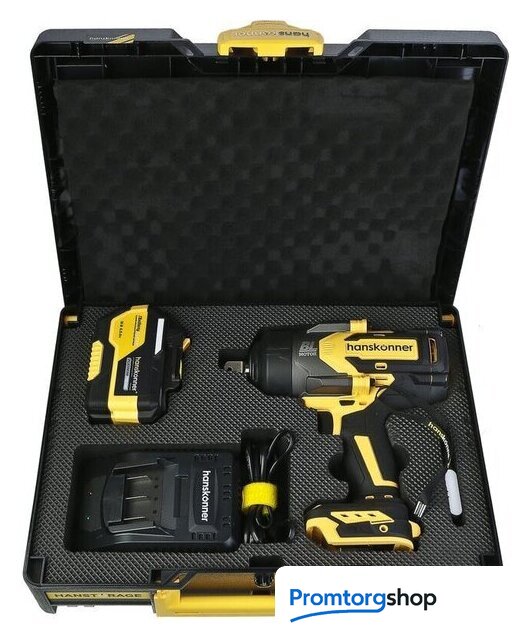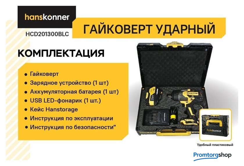 | Комплектация | - Гайковерт, - Зарядное устройство (1 шт), - Аккумуляторная батарея (1 шт), - USB LED-фонарик (1 шт.), - Кейс Hanstorage, - Инструкция по эксплуатации, - Инструкция по безопасности |