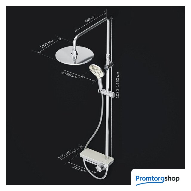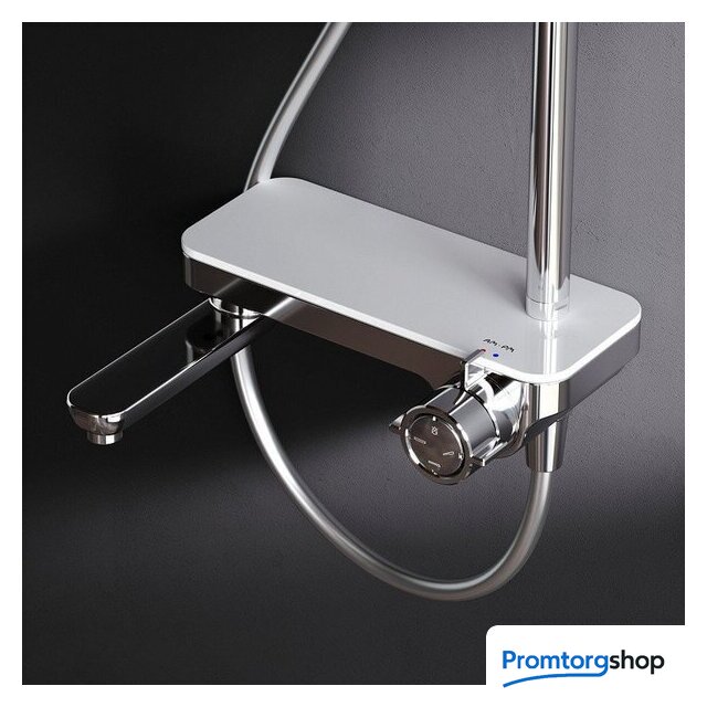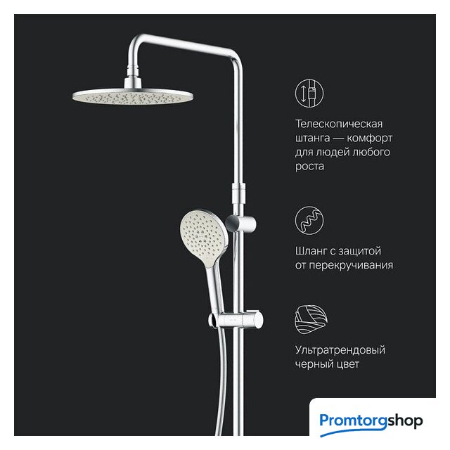 | Комплектация | верхний душ, штанга, ручной душ (лейка), держатель лейки, шланг, смеситель, излив для ванны, полочка |