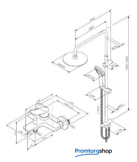 | Комплектация | верхний душ, штанга, ручной душ (лейка), держатель лейки, шланг, смеситель, излив для ванны |