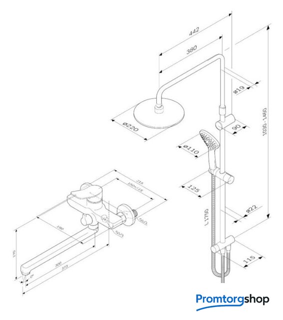 | Комплектация | верхний душ, штанга, ручной душ (лейка), держатель лейки, шланг, смеситель, излив для ванны |