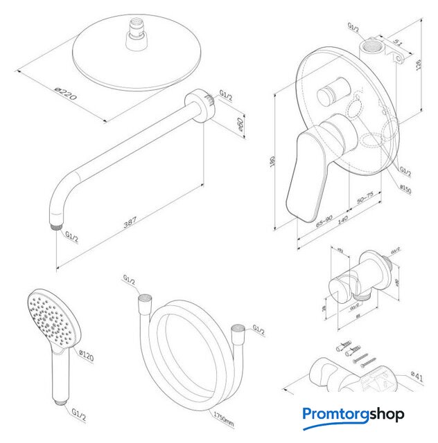 | Комплектация | верхний душ, ручной душ (лейка), держатель лейки, шланг, смеситель |