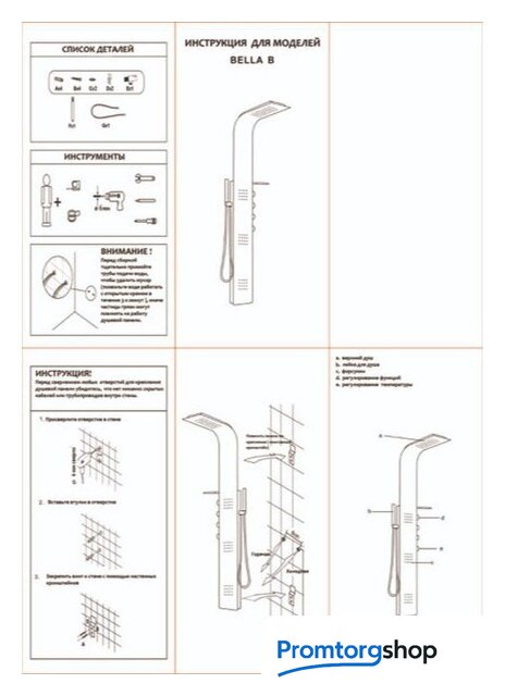 | Комплектация | верхний душ, ручной душ (лейка), держатель лейки, шланг, смеситель, полочка, боковой душ |