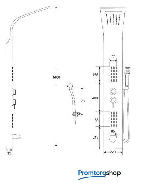 | Комплектация | верхний душ, ручной душ (лейка), держатель лейки, шланг, смеситель, излив для ванны |