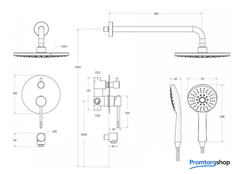 | Диаметр (ширина) верхнего душа | 220*220 мм |