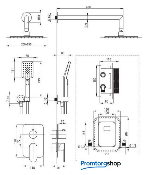 | Диаметр (ширина) верхнего душа | 250 мм |