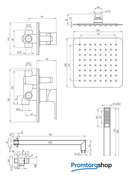 Комплектация | верхний душ, ручной душ (лейка), держатель лейки, шланг, смеситель |