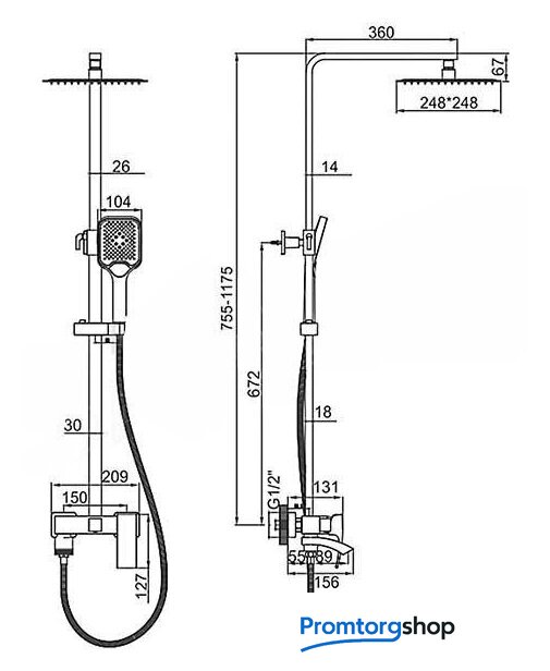 | Комплектация | верхний душ, штанга, ручной душ (лейка), держатель лейки, шланг, смеситель, излив для ванны |