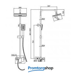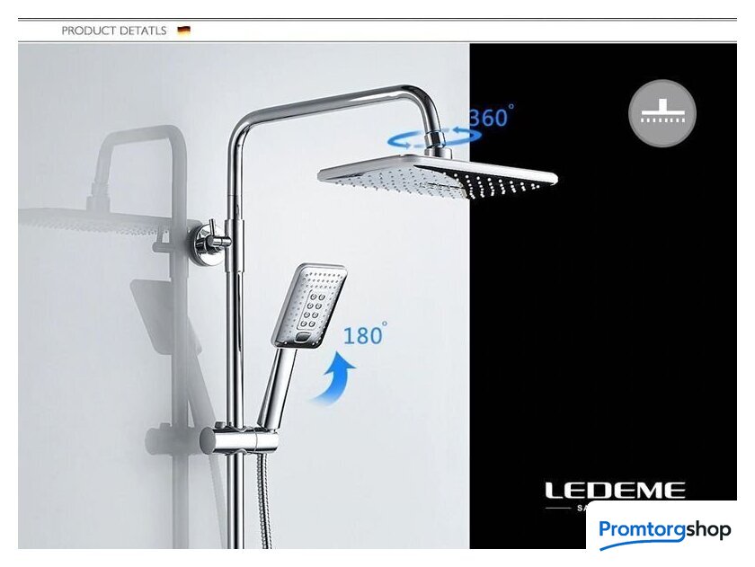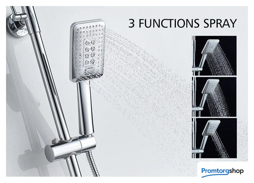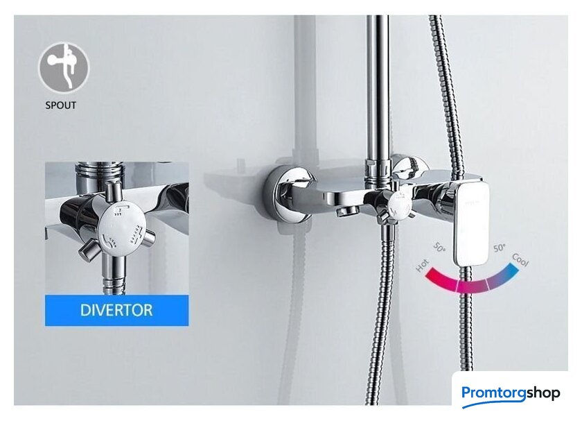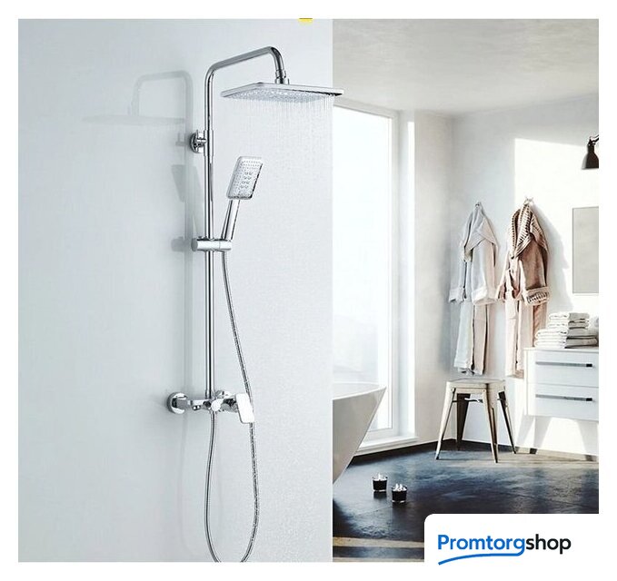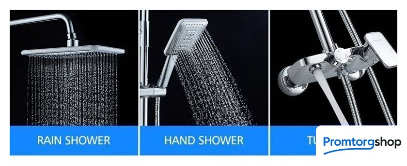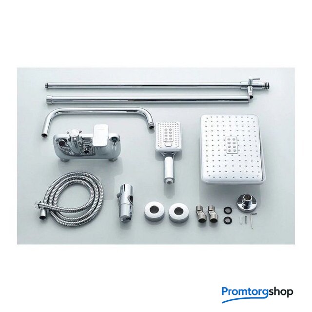 | Комплектация | верхний душ, штанга, ручной душ (лейка), держатель лейки, шланг, смеситель, излив для ванны, полочка |