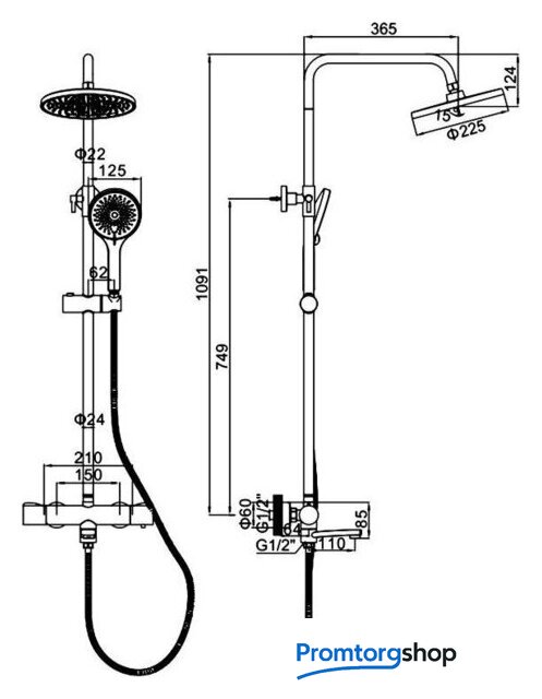 | Диаметр (ширина) верхнего душа | 225 мм |