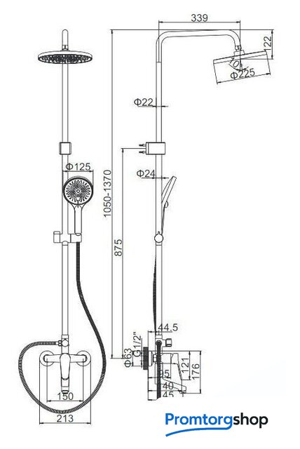 | Комплектация | верхний душ, штанга, ручной душ (лейка), держатель лейки, шланг, смеситель, излив для ванны |