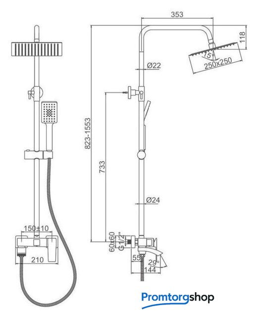 | Диаметр (ширина) верхнего душа | 250 мм |