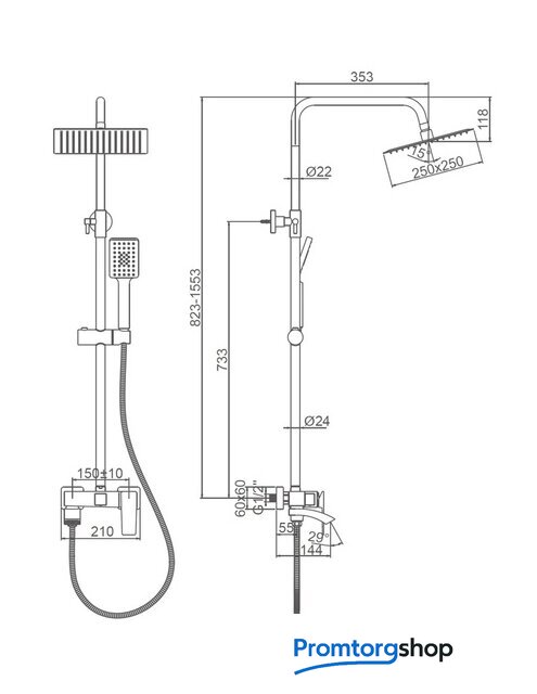Диаметр (ширина) верхнего душа | 250 мм |