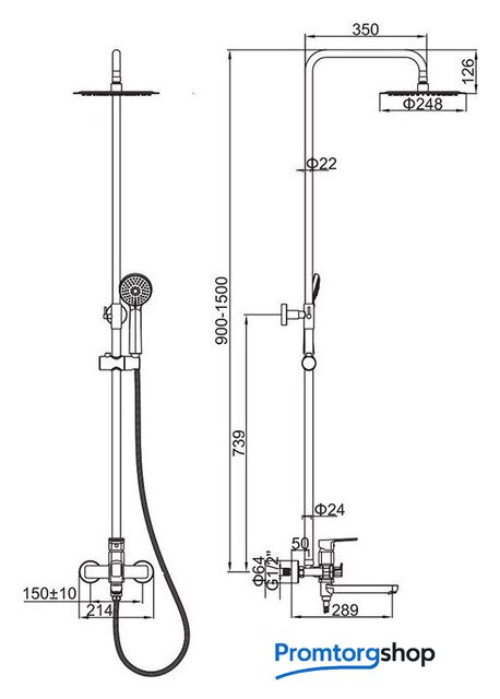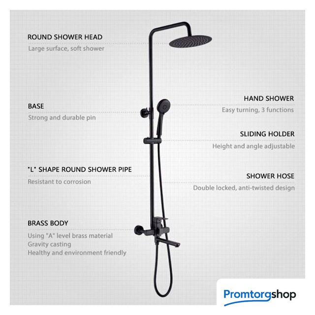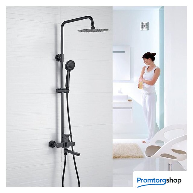 | Комплектация | верхний душ, штанга, ручной душ (лейка), держатель лейки, шланг, смеситель, излив для ванны |